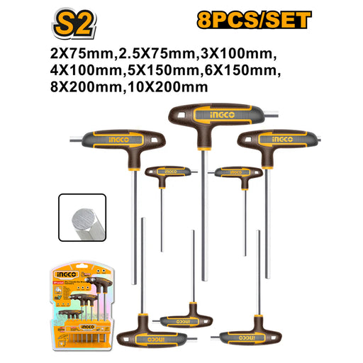 IngcoIngco 8 Pcs T-Handle Hex Wrench Set Specification: 8 Pcs T-handle hex wrench set Size:2X75,2.5X75,3X100,4X100,5X150,6X150,8X200,10X200 Material:Cr...