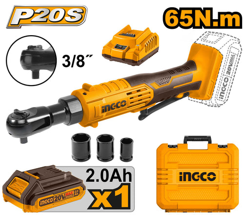 IngcoIngco 3/8" Cordless Drive Ratchet Specification: Voltage: 20V Max.torque: 65Nm Square Drive: 3/8" No-load speed: 250rpm Packed by carrying case...