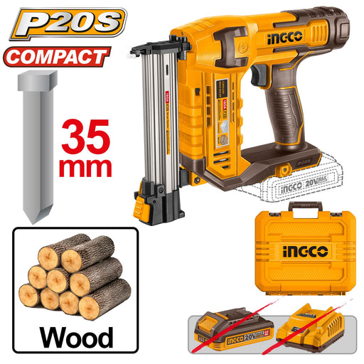 IngcoIngco 20V Cordless Pin Nailer Specification: Voltage: 20V Pin nailer type: 10-35mm Drive rate: 3nails/s Magazine capacity: 140pcs Battery and char...