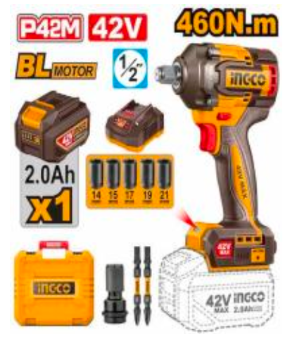 IngcoIngco 42V 460Nm Cordless Impact Wrench (Set) Specification: Brushless motor Voltage: 42V Square drive: 1/2" No-load speed: 0-1600/0-1900/0-2300rpm...