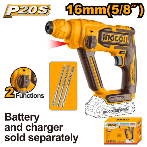 IngcoIngco 20V Li-Ion Cordless Rotary Hammer CRHLI20208 Specifications: Brushless motor Voltage: 20V No-load speed: 0-1100rpm Impact rate: 0-5400bpm Im...