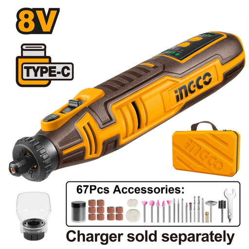 IngcoIngco 8V Li-Ion Cordless Grinder CMGLI0801 Specificaitons: Voltage: 8V No-load speed: 5000-25000rpm Charging via USB type-C cable(cable sold separ...
