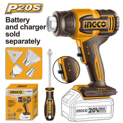 IngcoIngco 20V Cordless Heat Gun Specification: Voltage:20V Temperature:30-300℃/30-550°C Airflow:100/200 L/min Adjustable temperature with LCD d...
