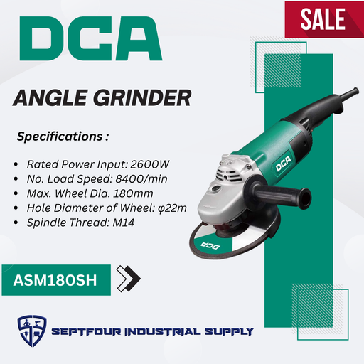 DCA 7" 2600W Angle Grinder ASM180SH Specifications : Rated Power Input:  2600W No. Load Speed: 8400/min Max. Wheel Dia. 180mm Hole Diameter of W...