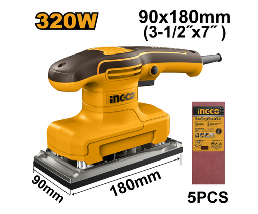 IngcoIngco 320W Finishing Sander Specification: Voltage:220-240V~50/60Hz Input power:320W No-load speed:14000rpm Bottom base:90mmx180mm Aluminum durabl...