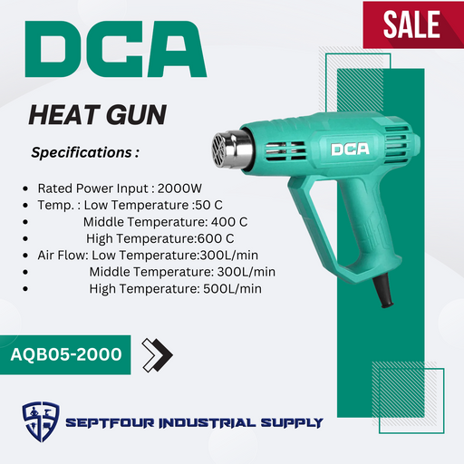 DCADCA 2000W Heat Gun AQB05-2000 Specifications: Rated Power Input : 2000W Temperature: Low Temperature :50 C Middle Temperat...
