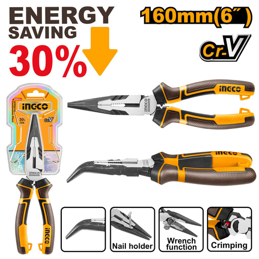 IngcoIngco 6" High Leverage Bent Nose Pliers Specification: Size: 6"/160mm Energy saving 30% than normal pliers Material: Cr-V Surface treatme...