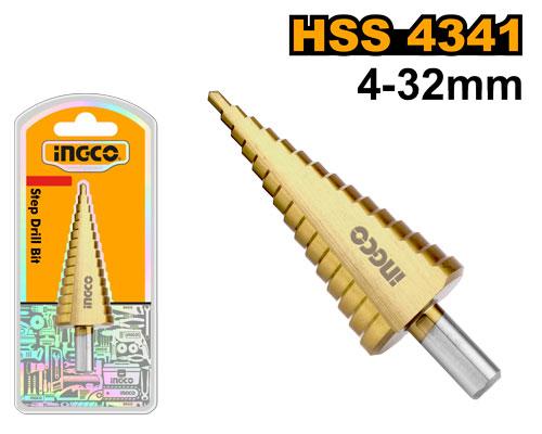 IngcoIngco 4-32mm Step Drill Bit Specification: HSS4341 Size:4-32mm Step: 2mm/step Titanium finishing Packed by double blister