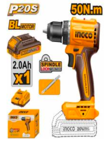 IngcoIngco 50N.m 20V Cordless Drill Specification: Brushless motor Voltage: 20V No-load speed: 0-550/0-2200rpm Max torque: 50Nm Plastic chuck Chuck ca...