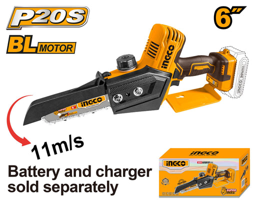 IngcoIngco 6" Cordless Pruner Saw Specification: Brushless motor Voltage:20V Bar length:6"(15cm) Chain speed:11m/s Auto lubrication Packed by color bo...