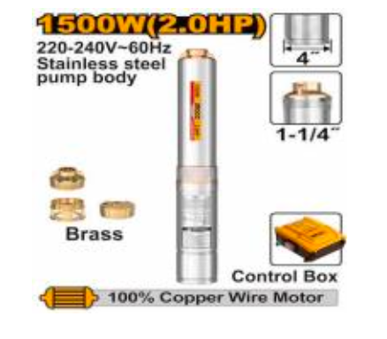 IngcoVoltage:220-240V~60Hz Ingco 4" Deep Well Pump 1500W 2.0HP Specification: Rated power:1500W(2.0HP) Max.head:135m Max.flow:6.7m³/h Pipe diameter:1...