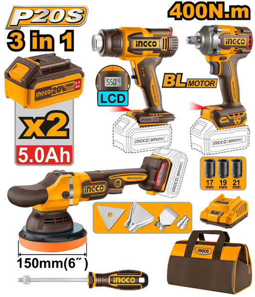 IngcoIngco Cordless 3pcs. Combo Kit - Cordless Impact Wrench(CIWLI20401) ,Cordless Polisher(APLI2015) and Heat Gun (HGLI2003)Specification: Rated Vol...