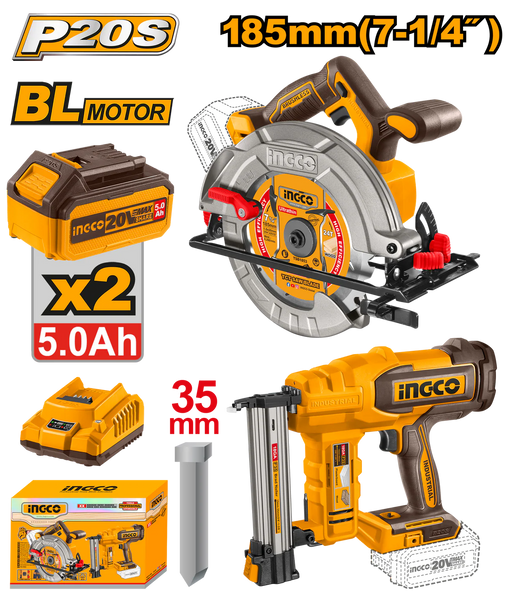 IngcoIngco 20V Cordless 2pcs. Combo Kit - Cordless circular saw(CSLI1851) and cordless bard nailer(CBNLI2005) Specification: Rated Voltage: 20V Cordle...
