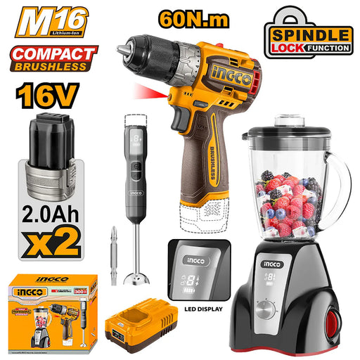 IngcoIngco 16V Cordless 3pcs Combo Kit - Compact Brushless Cordless Drill(CDLI16682) , Cordless Stand Blender (CJB050K) and Cordless Hand Blender (CHB...