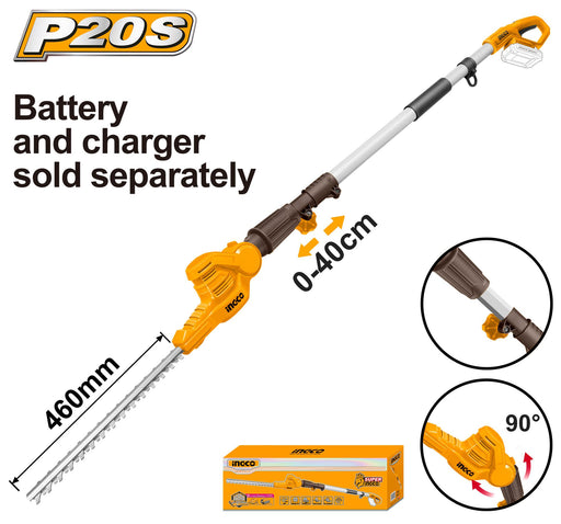 IngcoIngco 12V Li-Ion Cordless Pole Hedge Trimmer CPHT201601 Specifications: Voltage: 20V Blade cutting length: 460mm Maximum speed: 2800spm Maximum c...