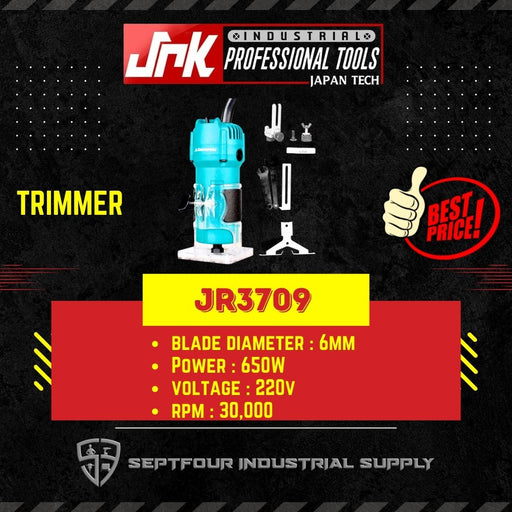 JRKJRK 6mm 650w Trimmer JR3709Specifications : Brand : JRK Model : JR3709 Power : 650w Capacity : 6mm Voltage : 220v -240v Application : wood Speed:...