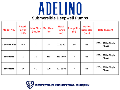 ADELINOAdelino 2.5"/ 3" /4" 2.5SGM/3SGM/4SGM Model Submersible Deepwell Pump See attached Product Specifications as per Model Brand : Adelino Size : 2.5"/...